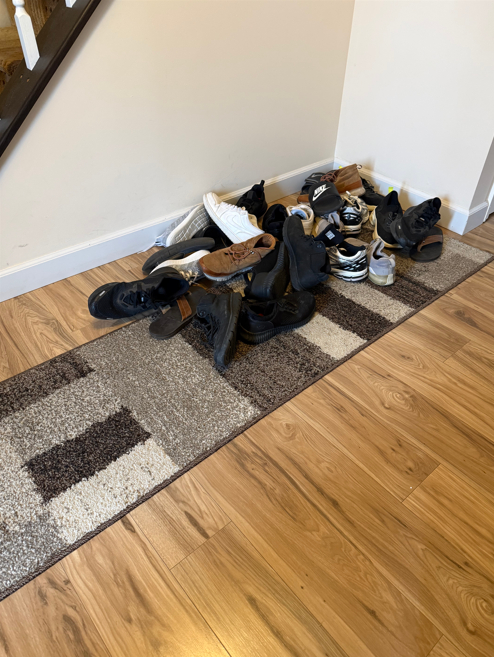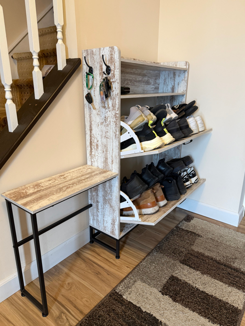 This one sits tight to the wall and still holds an entire household’s daily shoes.